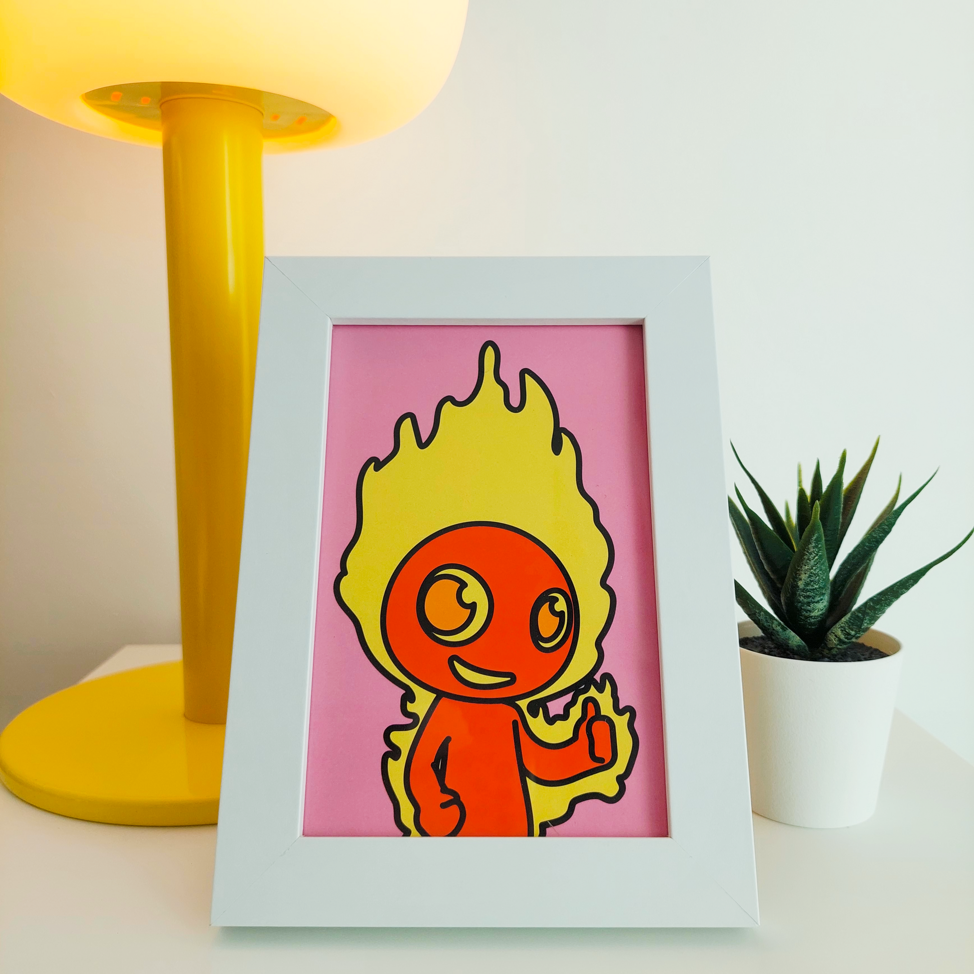 Most days, MATCH’s head glows like a tiny matchstick — but when he’s excited? WHOOSH! He lights up from head to toe. This 7x5 framed print brings a spark of joy and a flash of fire to your space.
