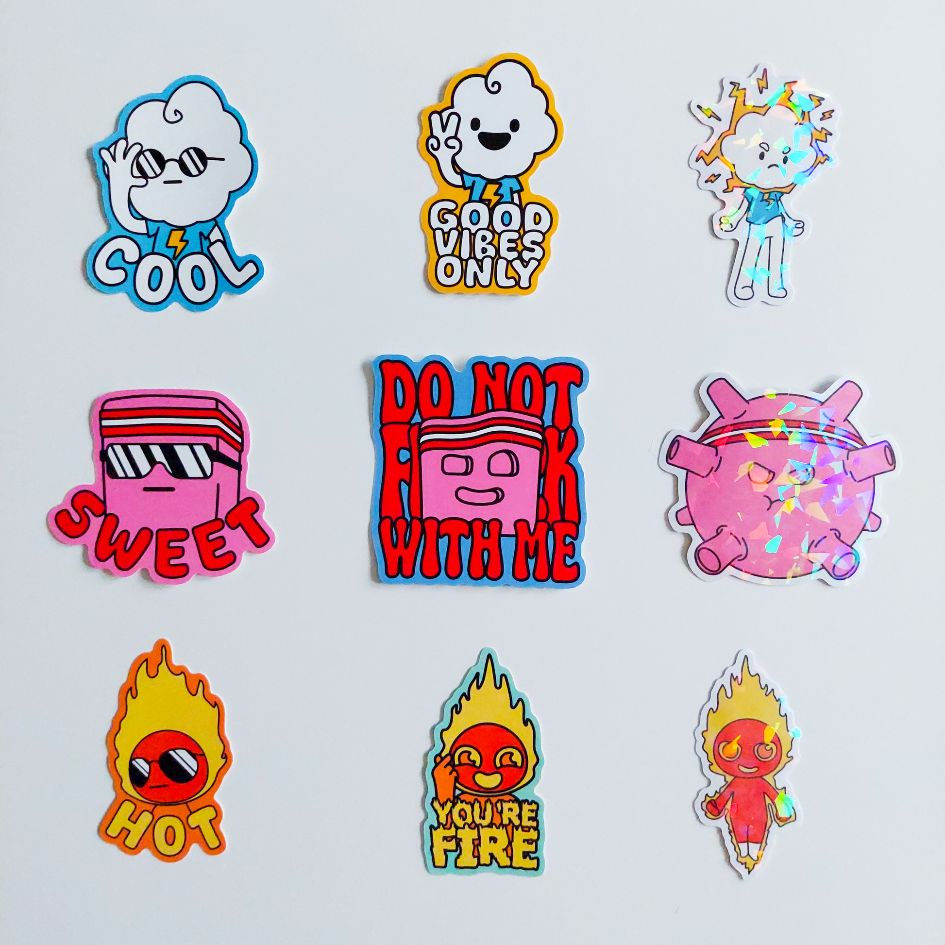 This 9-pack bundles all three characters with their 6 classic vinyl moods plus 3 holographic versions that bring extra sparkle and edge. These glossy 3-inch stickers add attitude, humour, and shine to laptops, water bottles, notebooks—wherever you want to stand out.